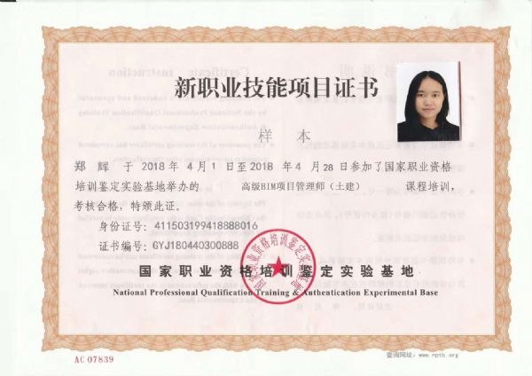 權威身份認可:國家職業資格培訓鑒定實驗基地頒發“BIM項目管理師”證書,該證書在國家職業資格培訓鑒定實驗基地網上查詢。
