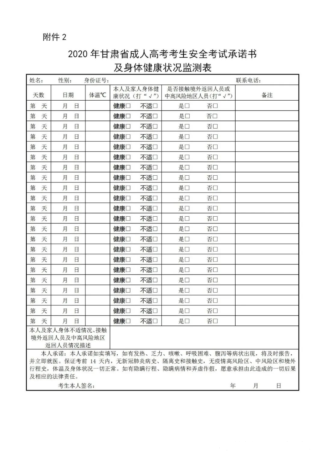 備注:考生應提前熟悉參加考試的考點和考場位置。為避免進入考場時,因體溫測量、身份識別等環節延誤入場時間,建議考生合理安排出行時間,提前到達考點。考生憑《準考證》(具體打印流程見第八條)、《身份證》、《甘肅省健康出行碼》(下載“健康甘肅”手機APP,進入考點時,向考試工作人員出示打印的符合疫情期間通行條件的“甘肅省健康出行碼”截圖,即“綠碼”,健康碼申領時間為考試當天或考試前一天)、《2020年甘肅省成人高考考生安全考試承諾書及身體健康狀況監測表》(見附件2)參加考試。考生考前14天內出現新冠肺炎疑似癥狀,或考前14天內有疫情高風險、中風險地區、境外旅行史、青島旅居史的,需持核酸檢測陰性證明參加考試。