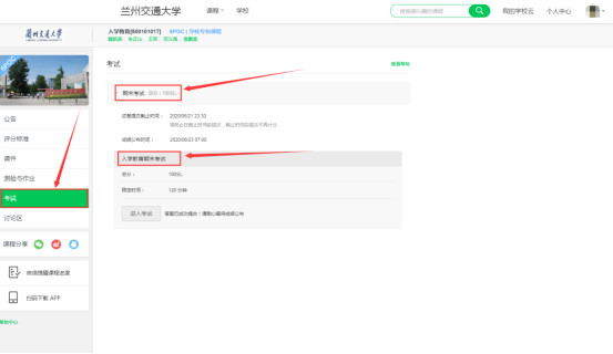 進入課程學習頁面后,點擊左側欄的“考試”,即可參加當前開放的考試。一般老師會在公告中,提醒考試卷子發布的信息。注意:因為考試被系統默認成計分項,進入考試頁面前,請仔細查看考試老師設置的相關信息。且一定注意是期末考試,非模擬自測。