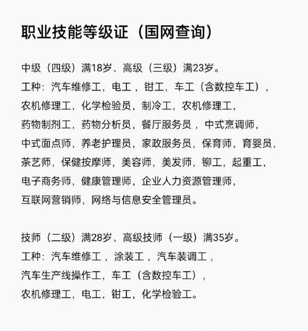 依據(jù)國(guó)家職業(yè)標(biāo)準(zhǔn),社會(huì)培訓(xùn)評(píng)價(jià)職業(yè)技能等級(jí)分五級(jí),分別為初級(jí)工(五級(jí))、中級(jí)工(四級(jí))、高級(jí)工(三級(jí))、技師(二級(jí))、高級(jí)技師(一級(jí))。其中,高級(jí)職稱相當(dāng)于高級(jí)技師(一級(jí))職業(yè)技能等級(jí)證,中級(jí)職稱相當(dāng)于技師(二級(jí))職業(yè)技能等級(jí)證,初級(jí)職稱相當(dāng)于高級(jí)工(三級(jí))職業(yè)技能等級(jí)證